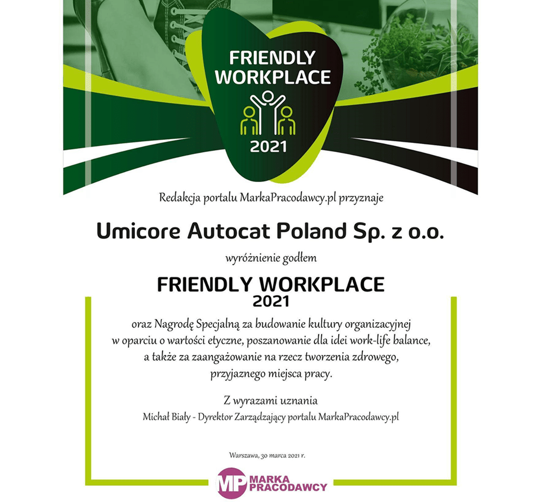 The Friendly Workplace 2021 title is a prestigious award granted by HR and EB experts of the MarkaPracodawcy.pl editorial board. As the Umicore Autocat Polska team, we are extremely proud to be among the laureates of this special recognition.
